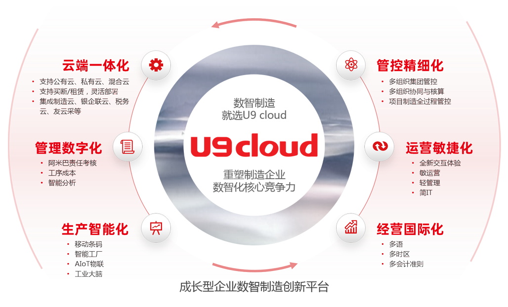 用友 U9 cloud 是一款面向成長型企業(yè)的數(shù)智制造創(chuàng)新平臺,作為用友精智工業(yè)互聯(lián)網(wǎng)平臺的重要組成部分,全 面運用移動互聯(lián)網(wǎng)、大數(shù)據(jù)、物聯(lián)網(wǎng)、人工智能等* 新技術(shù),融合 PLM、智能工廠、AIoT、制造云、營銷云、采購云、財務(wù)云、稅務(wù)云、人力云等服務(wù),構(gòu)建互聯(lián)互通的智能制造體系,真正幫助企業(yè)實現(xiàn)設(shè)計制造一體化、計劃執(zhí)行一體化、項目制造一體化、制造服務(wù)一體化、經(jīng)營核算精細(xì)化,為成長型企業(yè)打造一站式數(shù)智化升級方案,重塑制造企業(yè)數(shù)智化核心競爭力。