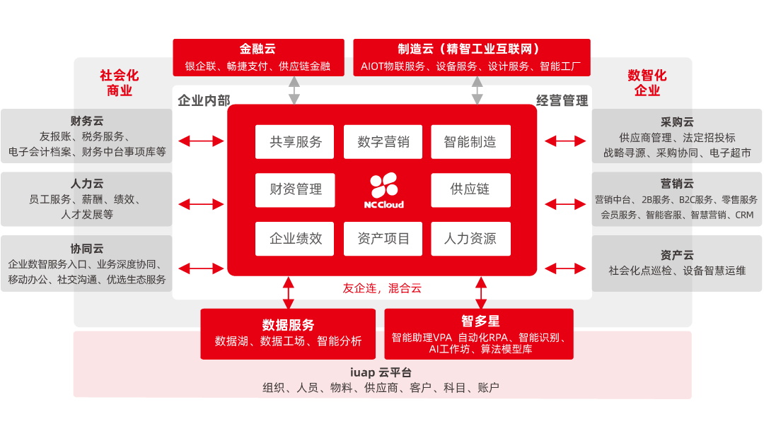 用友NC Cloud大型企業數字化平臺,深度應用新一代數字智能技術,完全基于云原生架構,打造開放、互聯、融合、智能的一體化云平臺,聚焦數智化管理、數智化經營、數智化商業等三大企業數智化轉型戰略方向,提供涵蓋數字營銷、財務共享、全 球司庫、智能制造、敏捷供應鏈、人才管理、智慧協同等18大解決方案,幫助大型企業全 面落地數智化。